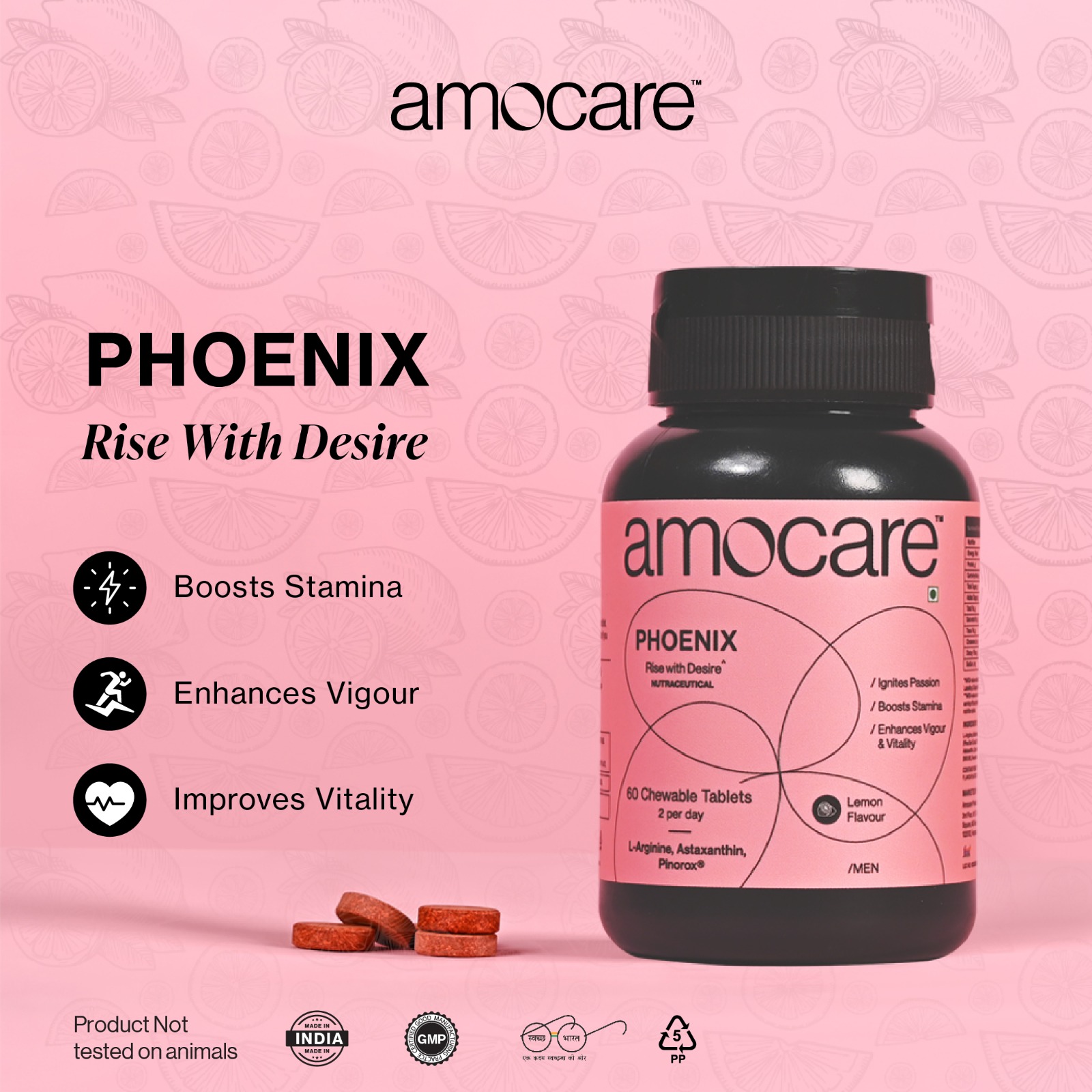 Phoenix Chewable Tablets,in lemon flavour, are formulated with a blend of natural and safe ingredients, including L-Arginine for enhanced blood flow, Astaxanthin, a potent antioxidant, and PinoroxR for improved blood flow and erectile function. Available in convenient and discreet 30 and 60 chewable tablet variants, this product is vegetarian, gelatin-free, gluten-free, nut-free, cruelty-free, trans fat-free, and contain no artificial colours.
