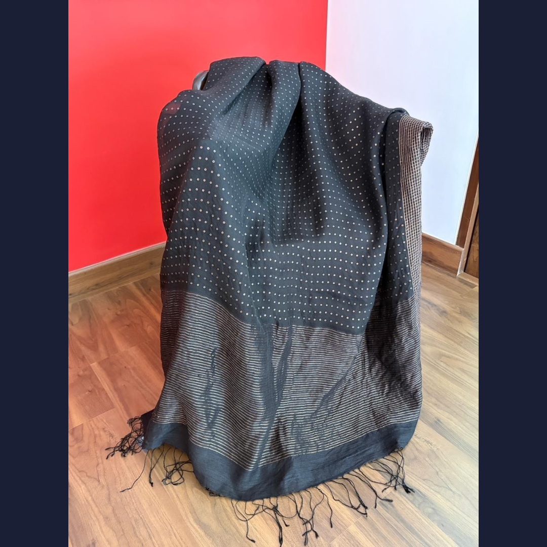 Visually, the sarees unfold as a study in depth and contrast. Against deep, inky bases, delicate gold sequin dots appear almost suspended within the fabric, catching light with movement rather than overt shine. Sections of the drape reveal dense, sculptural textures where layered yarns create a tactile surface, contrasting with the fluidity of the silk base. The result is a quiet radiance: fluid and lightweight. The palette embraces deep, after-dark tones including black, dark grey, and midnight blue, reinforcing the collection’s eveningwear sensibility while allowing the craftsmanship of the weave to take visual precedence. Produced intentionally in limited quantities, the collection prioritises individuality over replication, ensuring that each piece retains the feeling of a one-of-a-kind creation.