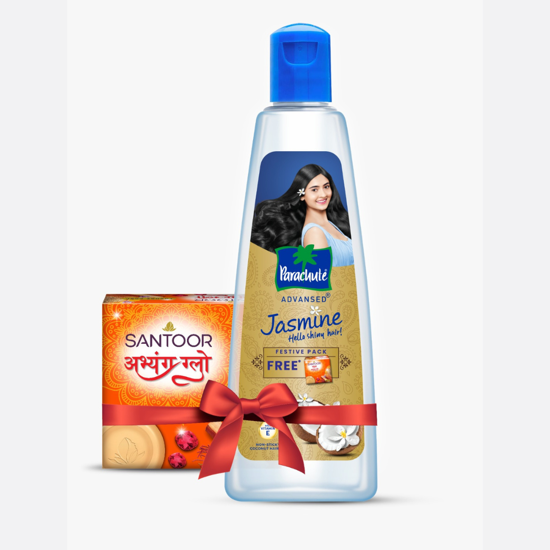 Parachute Advansed Jasmine Hair Oil provides gorgeous, shiny hair, while Santoor Abhyang Glow Soap leaves your skin radiant, ensuring you glow this festive season.