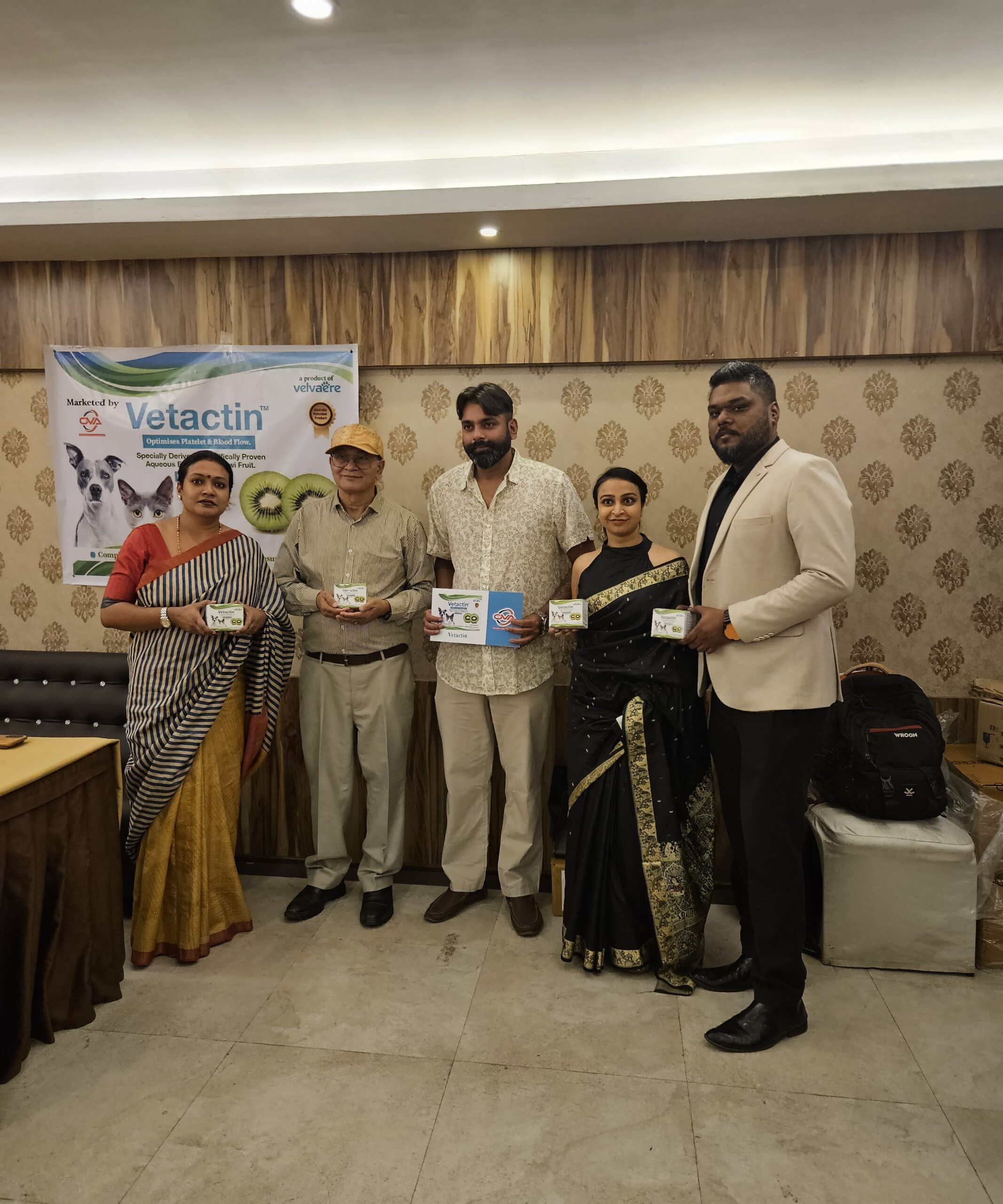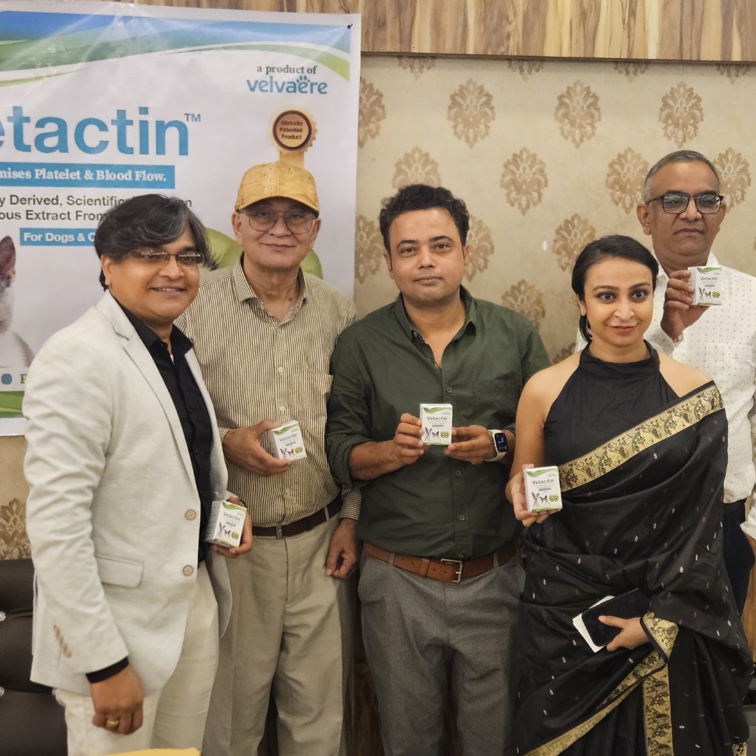 Kolkata, 10th November 2024: Kolkata-based pet food start up Velvaere, launched their first 100% natural platelet optimiser, Vetactin, scientifically proven, specially derived aqueous extract from Kiwi Fruit for dogs and cats by Dr. Asim Kanti Dutta Roy, Faculty Medicine University of Oslo, Nobel Penalist, Padmashree Nominee 2025. Dignitaries like Dr. Abhiroop Banerjee Veterinarian, Kolkata, BVMS (Bachelor of Veterinary Medicine & Science, Dr. Subir Bhattacharya, Dr.Krishanu ghosh, Dr.Abarno mahato and Dr. Swapan Ghosh, Veterinary Surgeon consultant were also present to grace the event.