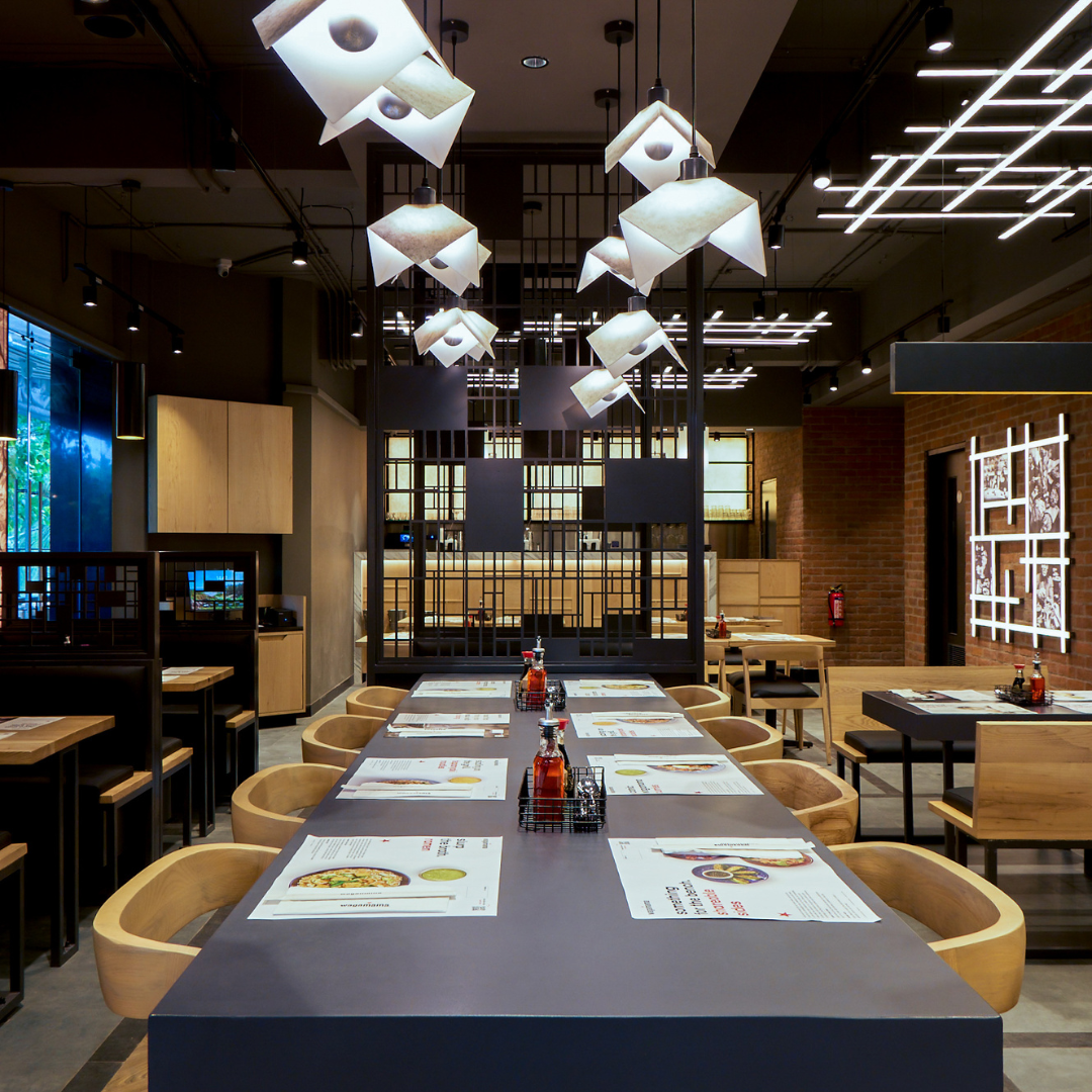 we threw convention in the bin when we introduced communal dining, and that same bold spirit shapes every wagamama space. minimal yet warm, our interiors blend bricks + concrete textures and wood, neutral tones and asian cues, inspired by japan’s timeless design and growing global influence. bench-style tables reflect our belief in egalitarian dining, while flexible seating welcomes all party sizes. open kitchens put freshness and transparency on show, nothing reheated, no short-cuts, just dishes fired up and served the moment they’re ready. every layout is built for flow, with clear sightlines that connect guests to the kitchen and each other. it’s fresh, full of soul, and just the kind of place you’d want to hang out in.