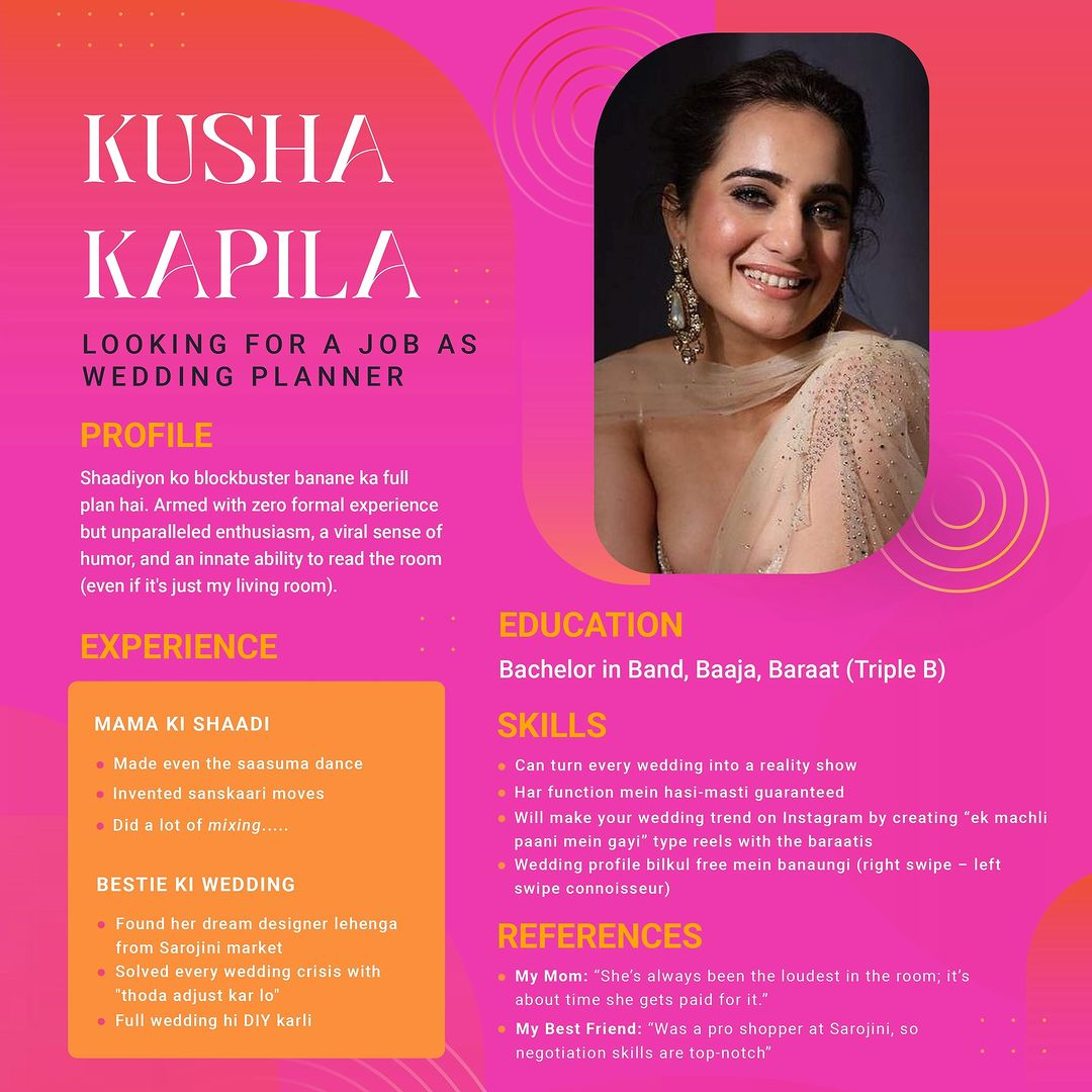 “Open to work as a wedding planner,” Kusha wrote. “Ghodi chahiye? vintage car? chalke aana hai? I’ll do it all.”